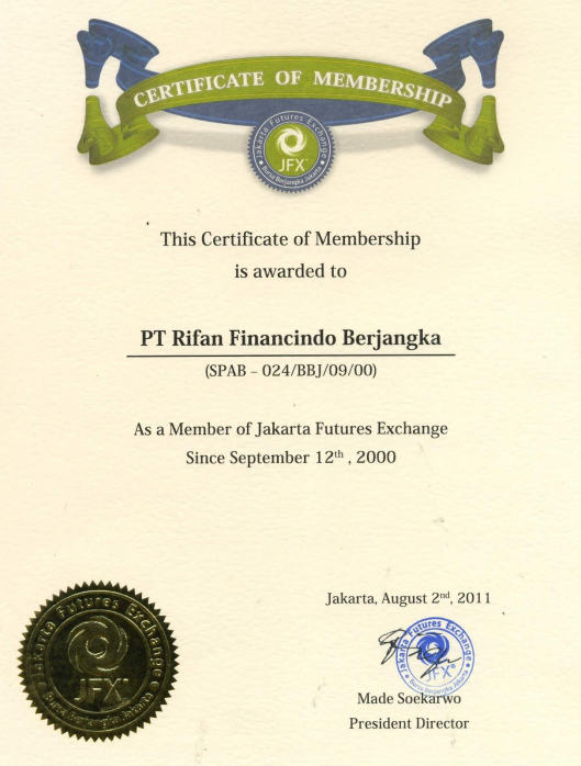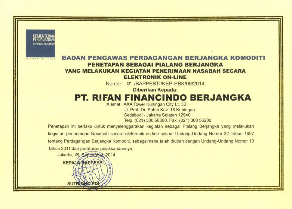 PT Rifan Financindo Berjangka (“RFB”) berpengalaman lebih dari 20 tahun di industri Perdagangan Berjangka Komoditi dan merupakan perusahaan pialang terbesar dengan menduduki posisi teratas dari 10 perusahaan pialang berjangka teraktif dari PT Kliring Berjangka Indonesia (Persero). Selain anggota dari KBI (Persero), PT Rifan Financindo Berjangka juga merupakan anggota PT Bursa Berjangka Jakarta dan terdaftar resmi di Badan Pengawas Perdagangan Berjangka Komoditi (BAPPEBTI). Sejak tahun 2000, PT Rifan Financindo Berjangka terus berkembang dengan jumlah kantor operasional sekarang di Jakarta (2 kantor), Bandung, Semarang, Solo, Yogyakarta, Surabaya, Medan, Pekanbaru dan Palembang.